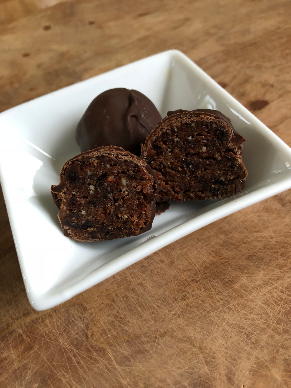 Roll the mixture into balls and dip into the melted chocolate and cool in the fridge.